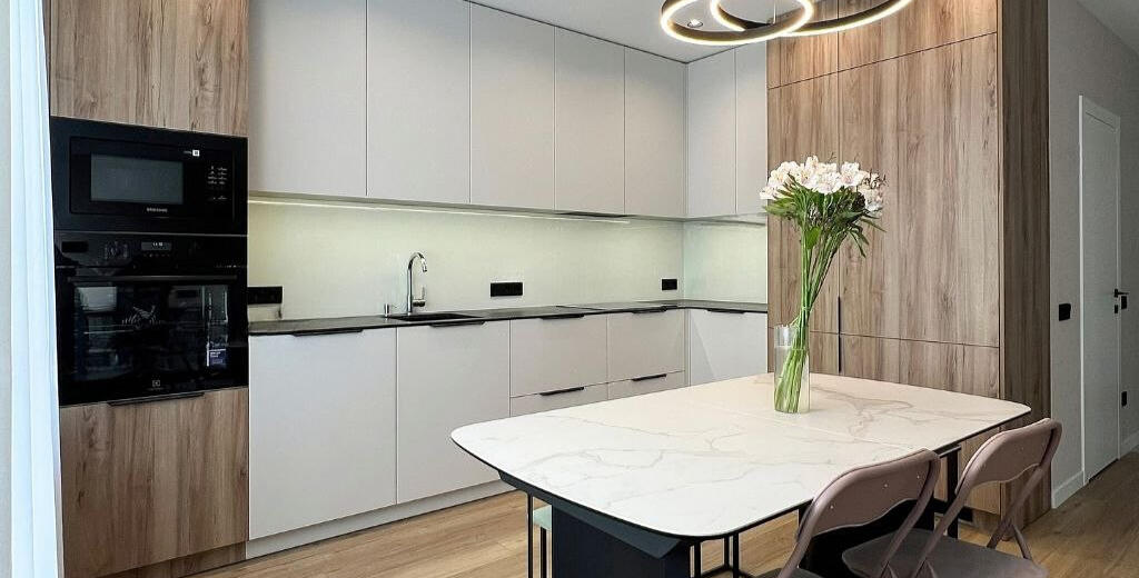Stan je opremljen u kombinaciji sivog mat MDF-a i drvenog dekora s izraženom teksturom, uz precizno izvedene spojeve i skrivena tehnička rješenja.